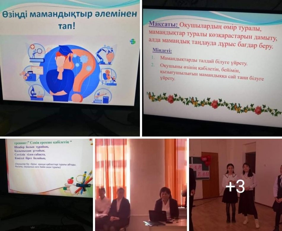 Мақсаты: Оқушыларды мамандық түрлерін, маман иелерімен таныстыра отырып,мамандық таңдауға бағыттау,кәсіптік бағдар беру. Болашақта кәсіби мақсатында дұрыс бағыт алған оқушы бойындағы қарым-қабілетін шығармашылықпен дамыта білсе, саналы маман ретінде қалыптасатыны белгілі. Оқушылар түрлі мамандық иелерімен тартымды әңгімелері үшін алғыс айтып,өнерлерін ортаға салды.
