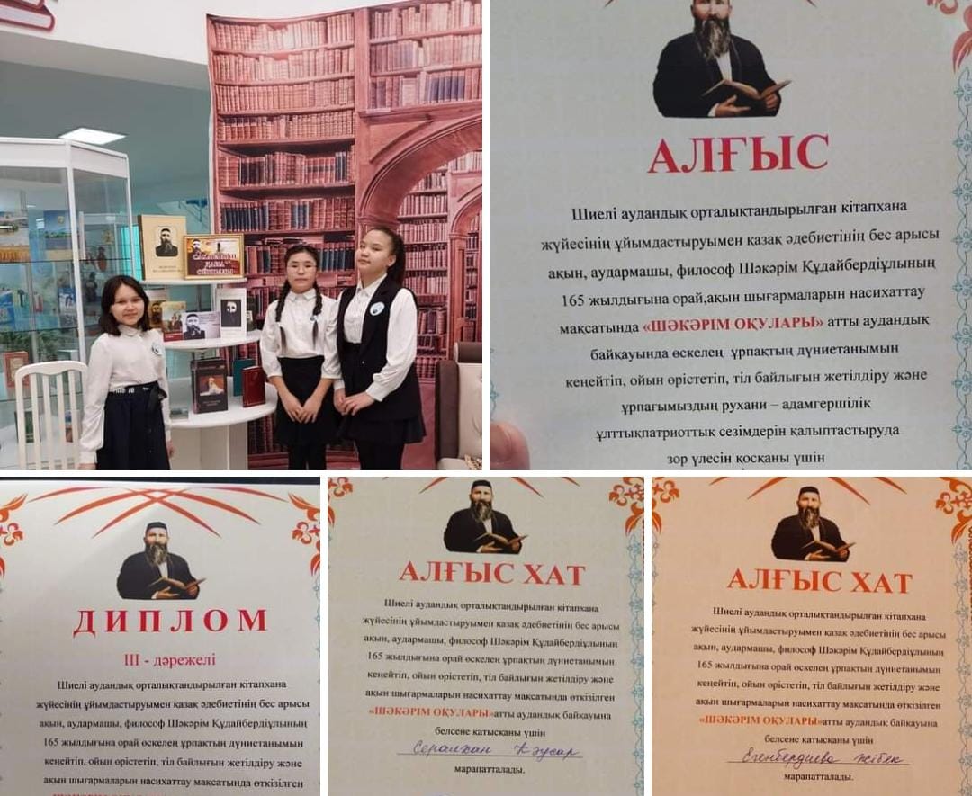 Шиелі аудандық орталықтандырылған кітапхананың ұйымдастыруымен Ш.Құдайбердіұлының 165 жылдығына орай өскелең ұрпақтың дүниетанымын кеңейтілген,шығармаларын насихаттау мақсатында өткізілген "Шәкәрім оқулары "атты аудандық байқауға қатысып 7"В"сынып оқушысы