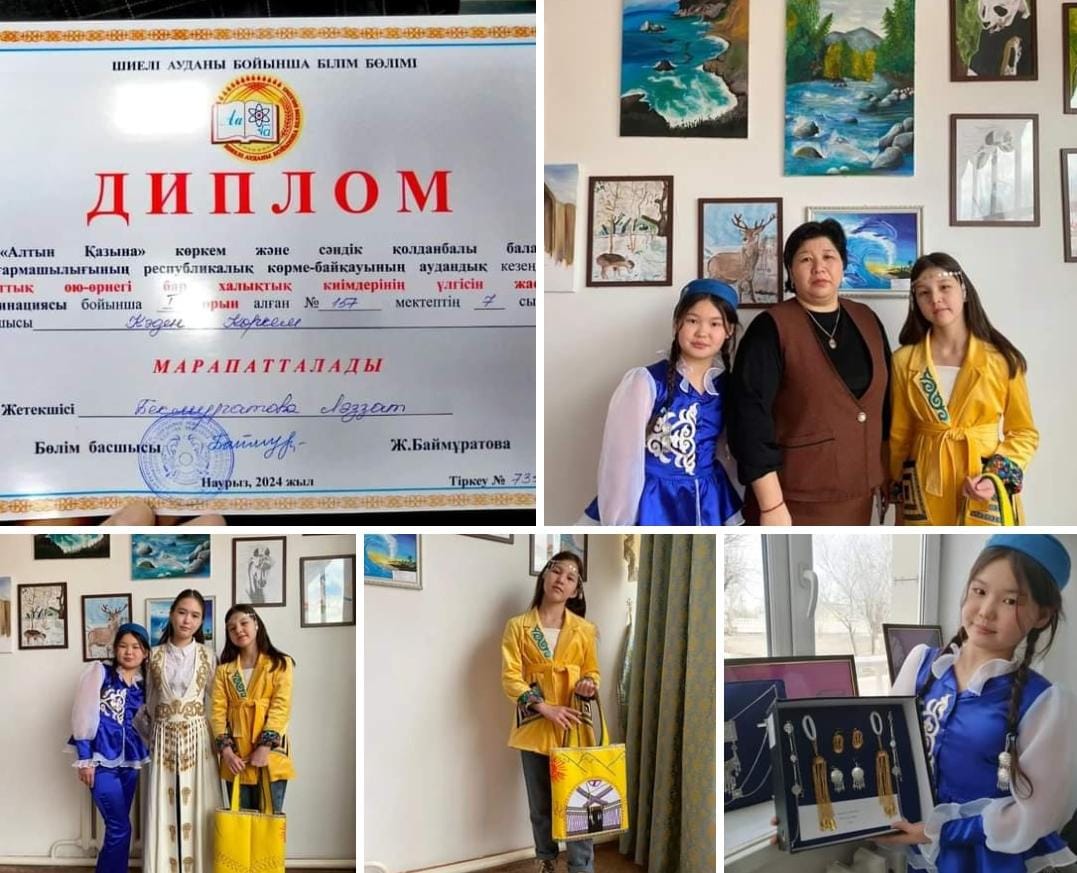 Шиелі ауданы бойынша білім бөлімінің ұйымдастыруымен "Алтын қазына" көркем және сәндік қолданбалы балалар шығармашылығының республикалық көрме-байқауының аудандық кезеңінде мектебіміздің технология пәні мұғалімі Бекмұратова Лаззаттың 7"А" сынын оқушысы Кәден Көркеммен "Ұлттық ою-өрнегі бар халықтық киімдерінің үлгісін жасау" номинациясы бойынша жүлделі I орынмен марапатталып, облыстық көрме-байқауға жолдама алды.